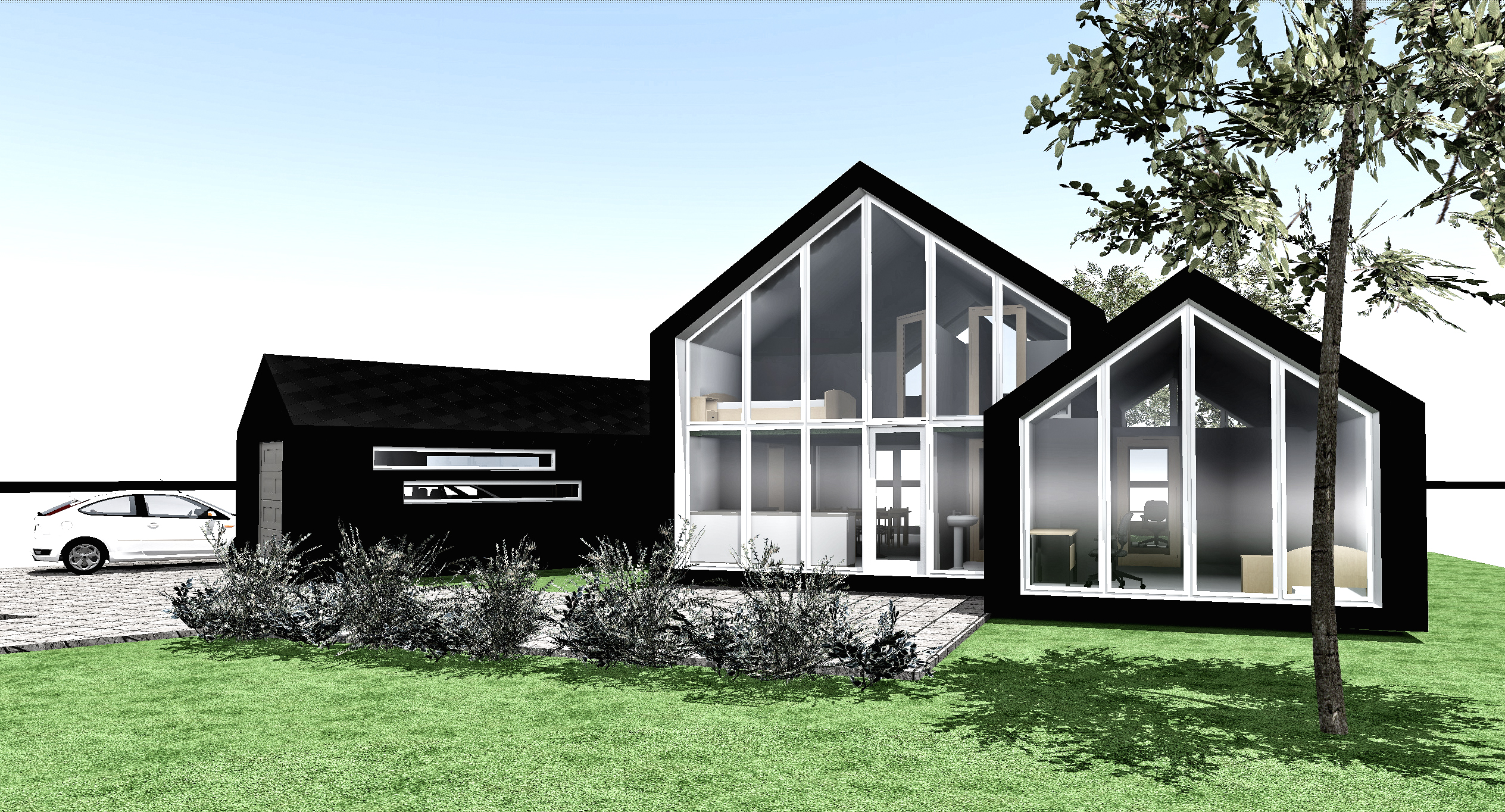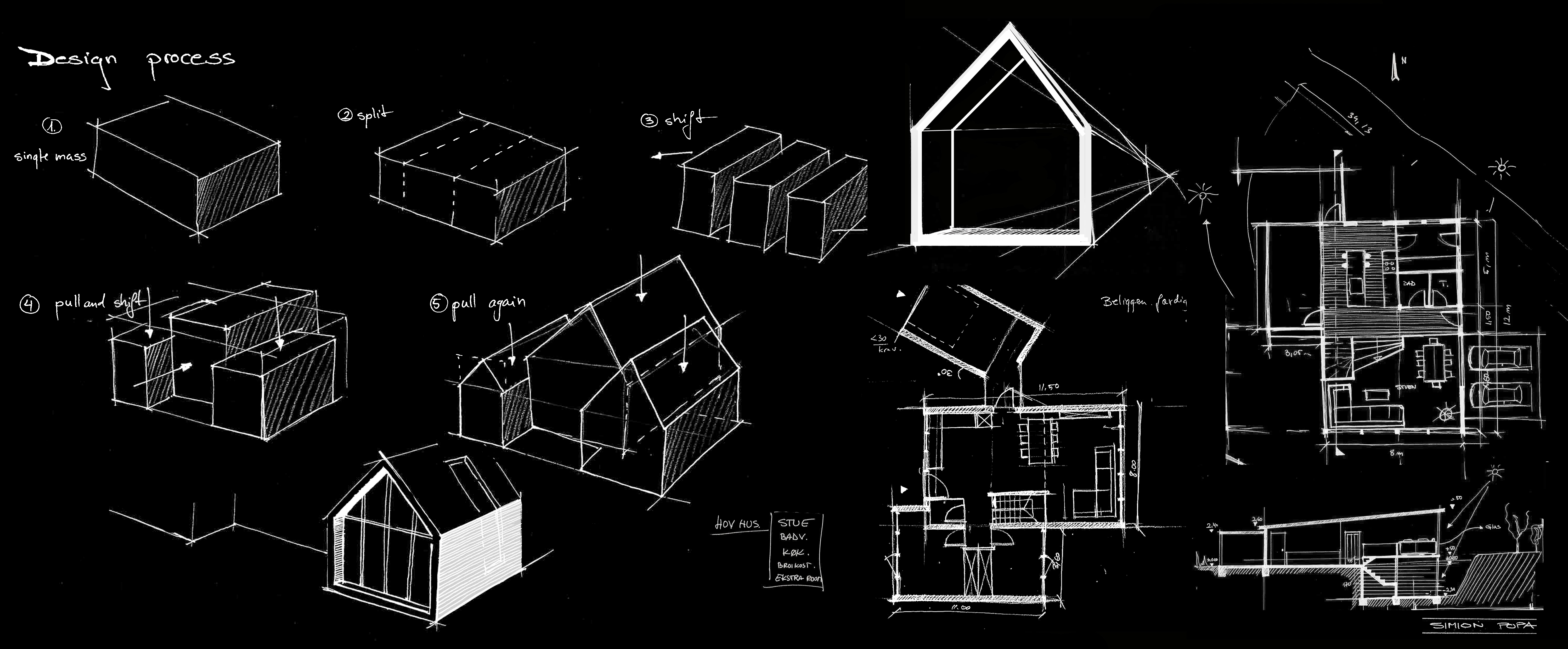 Her vil jeg præsentere fase 1 kaldet dispositionforslag. Nogle af punkterne i denne etape var: placering af hus på grunden, overordnet valg af materialer på tag, lofter, vægge, gulve og fastlæggelse af Indretning. Teknik: håndskitse og tegneprogram Software: Archicad, Artlantis, Photoshop og Excel.